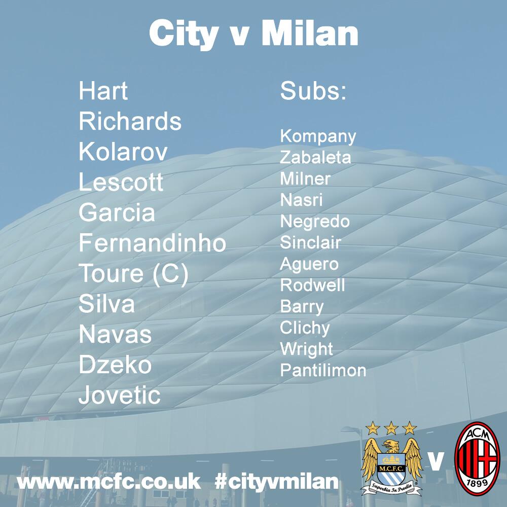 Hart, Richards, Kolarov, Lescott, Garcia, Fernandinho, Toure, Silva, Navas, Dzeko, Jovetic