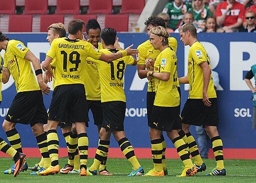 El equipo de Klopp salió al campo a no especular y a jugar al fútbol que tanto gusto el año pasado. No se guardo nada en la recámara para este inicio de liga para los amarillos y eso se notaba en los primeros minutos de juego con el excelente trato de pelota en el toque y la rapidez de sus combinaciones. El equipo local con excesiva valentía intentaba meter a Gundogan y sus compañeros en su área pero teniendo un manejo de balón tan bonito no se dejaban amedrentar en ningún momento y se pasaban sin ninguna dificultad. Tardó poco en llegar el gol visitante de los favoritos sobre el terreno de juego, cosa que sucedió en el minuto 24 por parte de Aubemeyang tras pase de su compañero Schmelzer. Resultado normal hasta el momento sin nada que objetar al equipo dirigido por Klopp que permanecía tranquilo en la banda viendo las acciones de su equipo. El equipo de Dortmund muy tranquilo en su juego, con conformidad, pues ellos iban por delante y no querían asumir riesgos tocando la pelota. Los locales asumieron riesgos en el último tramo del primer tiempo intentando marcar el empate cosa que casi logran si Bender no logra salvar de cabeza bajo la línea de gol antes del minuto 42 de juego. Holzshauser estaba siendo uno de los jugadores más destacados en este primer período brillando con disparos desde más allá de la frontal cómo hizó antes del minuto 30 y en el minuto 42, buen centrocampista en sus labores determinadas por su míster. Al descanso se fueron con 0-1.