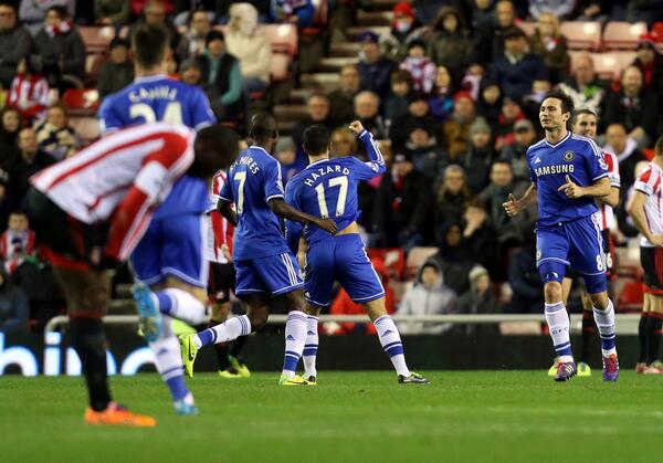 Lampard juega deliciosmente por encima de la defensa de Sunderland , pero Torres es incapaz de tenerla bajo control y es desplazada por la defensa.