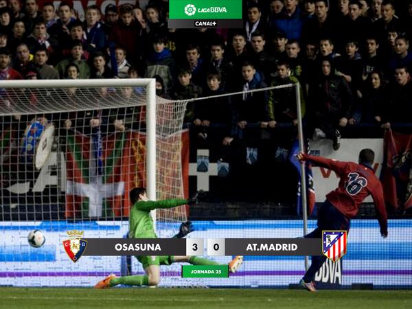 El Atlético de Madrid se ha dejado el coliderato de la Liga BBVA en su visita a El Sadar tras salir derrotado contundentemente contra Osasuna (3-0) gracias a los tantos de Cejudo, Armenteros y Roberto Torres en una primera parte soñada para los rojillos y de las peores de la era Simeone.