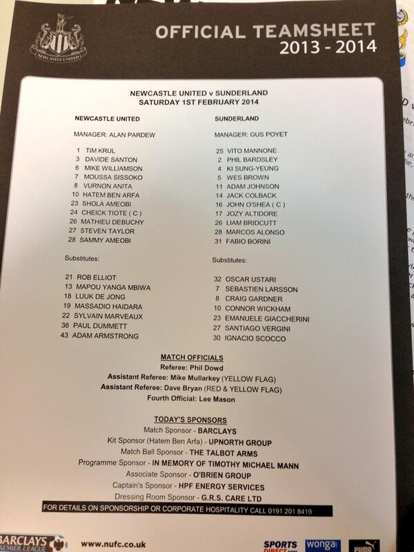 Newcastle : Krul; Debuchy, Williamson, S.Taylor, Santon; Tiote (c), Sissoko, Anita; Ben Arfa, Shola Ameobi, Sammy Ameobi.