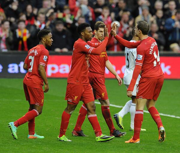 Fue un partido muy bonito y disputado por ambos conjuntos que terminó con un amplio marcador y muy ajustado. El primero en golpear en el partido fue el Liverpool por medio de Sturridge a los 3' con un chut potente que se coló por el centro de la portería de Vorm. Henderson a los 20' marcó un bonito tanto por la escuadra izquierda que suponía el 2-0. El Swansea pronto recortó la ventaja, por medio de Shelvey desde el borde del área a los 23'. Bony a los 27' ponía de nuevo las tablas al rematar de cabeza una falta botada al área. A los 36' era Sturridge el que anotaba de cabeza el 3-2. Antes del descanso pudo empatar el Swansea en ocasiones de Bony y Dyer.
