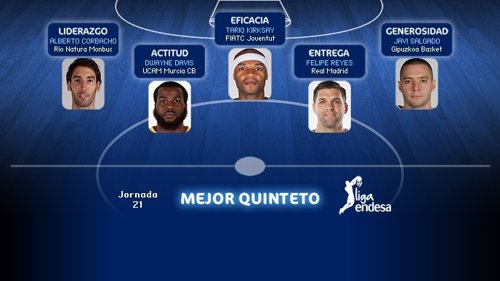 Los jugadores Alberto Corbacho (Liderazgo), Tariq Kirksay (Eficacia), Dwayne Davis (Actitud), Javi Salgado (Generosidad) y Felipe Reyes (Entrega), conforman el Mejor Quinteto Liga Endesa de la Jornada 21.