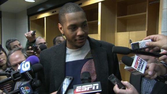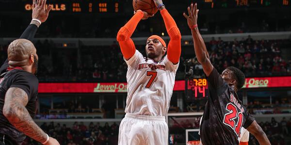 Anthony ha dicho que planea convertirse en agente libre este verano , y había al menos un signo para pedirle que venga a Chicago. " No puedo ver el año que viene ", dijo Anthony . " Ni siquiera puedo ver mañana en este punto. " ... Stoudemire y Tim Hardaway Jr. tuvieron 14 puntos cada uno para Nueva York. ... Los Bulls mejoraron su marca a 14-2 en esta temporada cuando anotan 100 puntos o más. ... Los Bulls y los Knicks tienen una reunión más programado , el 13 de abril en Nueva York.