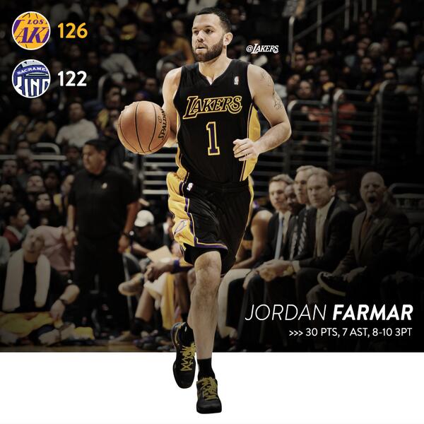 Jordan Farmar anotó un récord personal de 30 puntos desde la banca , por lo que ocho de 10 tiros desde la línea de 3 puntos , y los Lakers se aprovechó de la ausencia de DeMarcus Primos estrellas Sacramento suspendido para vencer a los Reyes 126-122 la noche del viernes .