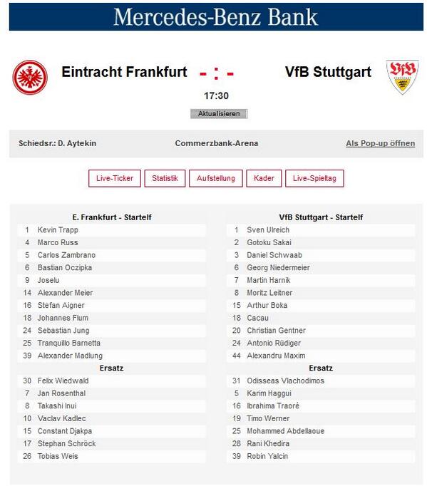 VfB mostró en Frankfurt una disciplina defensiva y combativa. Ofensivamente, los jugadores de Thomas Schneider eran peligrosos a la contra de nuevo y tenía mucho tiempo merece. Sin embargo, en la fase final de la reunión de Frankfurt en dos ocasiones, por lo que el equipo debe ser golpeado con el anillo rojo en el pecho Principal. Durante el juego en Frankfurt VfB capitán Christian Gentner regresó a la alineación titular. Junto a él, Moritz Leitner jugó en el centro del campo defensivo. El internacional sub-21 había pasado debe suspender debido a una barrera de color amarillo-rojo. Además, Cacau fue la primera vez en la temporada desde el principio. Él actuó como único delantero. Para Timo Werner, Rani Khedira y Mohammed Abdellaoue obtuvieron el primer lugar en el banco. Arthur Boka mueve de la posición de centrocampista defensivo en el extremo izquierdo. Según primeros minutos equilibrados los anfitriones tuvieron la primera ocasión del partido. Tranquillo Barnetta se dirigió a casa de cerca a la meta del VfB, pero Sven Ulrey estaba en guardia, y paró la pelota con un buen reflejo de (6). Como resultado, Frankfurt tuvo inicialmente más posesión, pero el equipo con el anillo en el pecho de color rojo estaba a salvo a la defensiva y no tenía más posibilidades de concordia. Alexandru Maxim fue en la 18 ª Minuto, la primera vez que se presentó con una pelota que rebota desde una distancia de Frankfurt portero Kevin Trapp a prueba. Tras el VfB jugó defensivamente más disciplinada, conquistó una y otra vez la pelota y poner uno u otro mostrador. Al igual que en el 31 Alexandru Maxim ajuste minutos a Martin Harnik y los austríacos de 16 yardas para liderar al equipo con el anillo en el pecho de color rojo se reunió. Cuatro minutos fue seguido por un contador renovada y una nueva oportunidad para VfB: Cacau disparó desde 14 metros, pero el arquero Kevin Trapp Eintracht recibido a tiempo los brazos y desvió el balón por encima del travesaño. Además, Martin Harnik perdió la carcasa de la máquina en una situación prometedora sólo ligeramente (38). ¿El equipo de Thomas Schneider a los 20 minutos aumentó de marcar ocasiones, los jugadores del VfB en la primera sección de juegos eran defensivamente aún compacta, se apoyaron mutuamente y hacer hasta el silbato de medio tiempo no hay posibilidades de Frankfurt, así que 1-0 a los 45 minutos para el equipo con el anillo de pecho rojo tenía existencias.