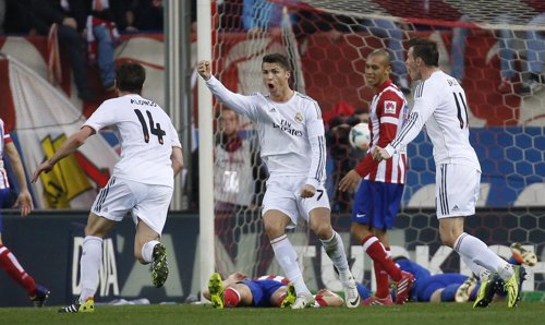 Atlético de Madrid y Real Madrid firmaron las tablas (2-2) en el derbi madrileño correspondiente a la vigésimo sexta jornada de la Liga BBVA, donde el conjunto de Carlo Ancelotti sacó un punto de su visita al Vicente Calderón gracias al tanto de Cristiano Ronaldo a siete minutos del final, por lo que acaba la jornada como líder en solitario de la Liga y mantiene los tres puntos de distancia con el conjunto rojiblanco.