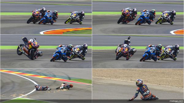 Fue el preludio de una sucesión de caídas en el trazado maño. La más polémica, la que implicó a Márquez y a Miller, que después de un toque entre ambos dio con el australiano en el suelo; el incidente sería investigado, aunque parecía que el catalán le tenía ganada la posición e iba por la trazada buena. Miller, visiblemente enfadado, conseguía continuar y, aunque volvería a caerse, concluir la carrera.