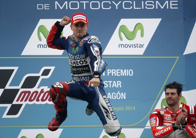 El español Jorge Lorenzo (Yamaha) ha conseguido este domingo su primera victoria del año en MotoGP en el accidentado Gran Premio de Aragón, en el que el Aleix Espargaró (Forward Yamaha) y el británico Cal Crutchlow (Ducati) le han acompañado en el podio y en el que las caídas por la lluvia de Marc Márquez y Dani Pedrosa (Repsol Honda) han servido en bandeja la victoria al balear.