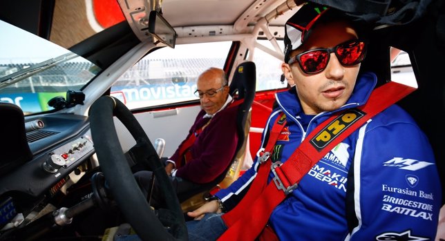 El piloto de MotoGP Jorge Lorenzo (Yamaha) dio este jueves unas vueltas al antiguo circuito urbano de Guadalope, en el centro de Alcañiz (Aragón), con el consejero delegado de Dorna, Carmelo Ezpeleta, como copiloto en una exhibición donde el mallorquín deleitó al público que llenó las calles de la localidad.