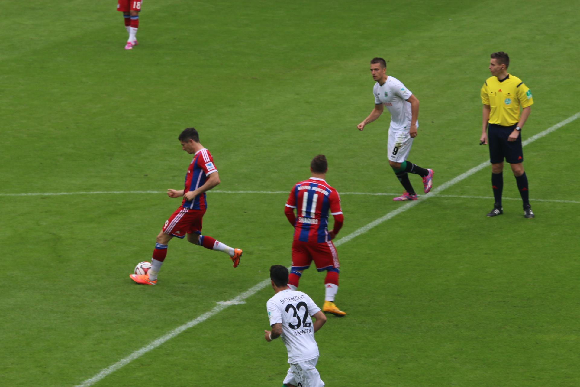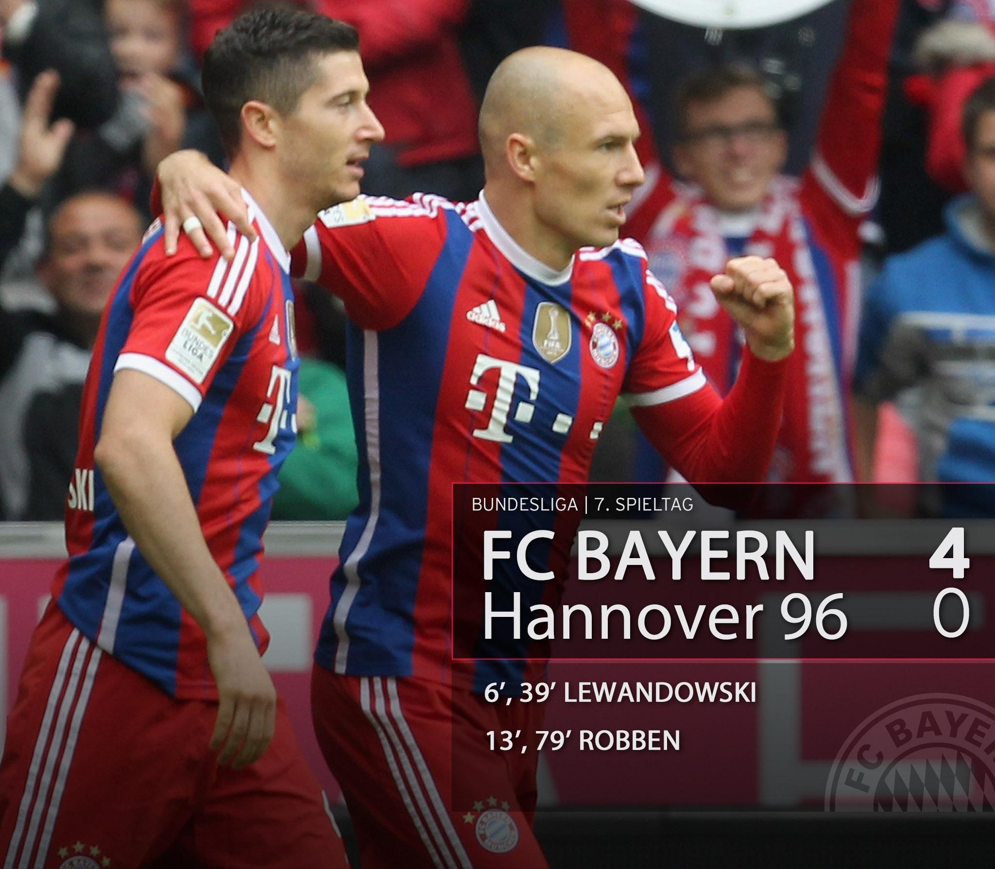 El comienzo del equipo de Guardiola fue espectacular con unos primeros 15 minutos de ataque y buen juego atacante aunque el rival le dejo huecos de los que ni un principiante se dejaría si hubiera concentración al 100%. Pero este equipo bávaro hoy quería callar bocas de aquellos que le critican en su juego en menos de 10 minutos lograron encarrilar el partido con 2 goles que le ponían el camino fácil para llevarse los tres puntos de hoy antes de la cita de las selecciones nacionales de la próxima semana con el correspondiente parón que sufrirán las ligas de los respectivos países. El primer gol fue de Robert Lewandovski en el minuto 6 de juego y en el 13 llevaba el balón a las redes Arjen Robben. Un partido desde entonces sencillo para el equipo local aunque la afición exigiera ser más demoledor sobre el terreno de juego. Xabi Alonso es la manija del equipo y su categoría esta fuera de toda duda, hasta se atrevía lanzar a portería de fuerte disparo desde una distancia superior de 60-65 metros. Desde ese momento un sólo protagonista hasta el pitído final del arbitro para dar el correspondiente descanso a ambos equipos, y ese Robben, si aquel que otros clubs desecharon por tener 2 huesos de cristal"logra desequilibrar a aquel que se le pone por delante con calidad y un regate eléctrico que asusta y que genera peligro allí a dónde va. Hoy si era el Robben qué te gana y llama la atención. Fruto de ese impetú llegó el tercer gol del equipo local obra de Lewandovski en el minuto 39 de juego que dejaba el partido cerrado totalmente.