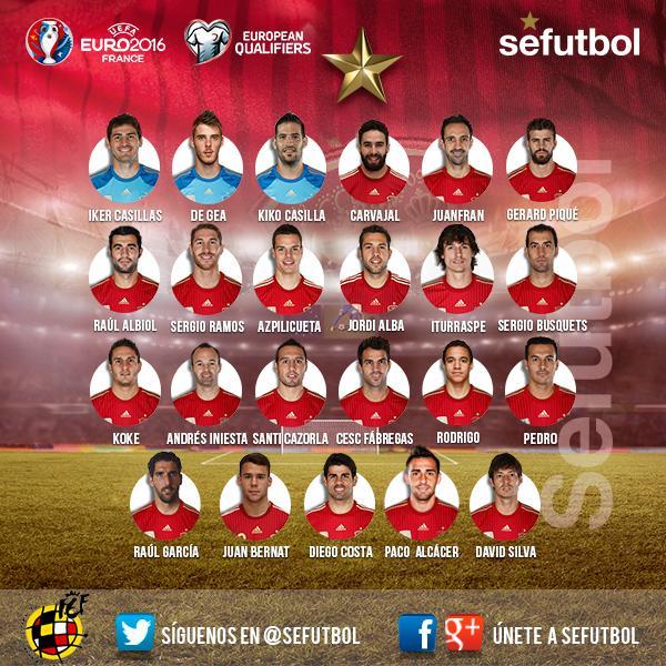 DEFENSAS: Dani Carvajal (Real Madrid), Raúl Albiol (Nápoles), Juanfran (Atlético Madrid), César Azpilicueta (Chelsea), Sergio Ramos (Real Madrid), Jordi Alba (Barcelona) y Gerard Piqué (Barcelona)