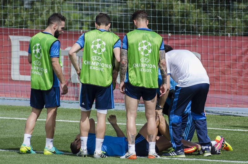 Molestias en su pierna izquierda le han impedido acabar el ejercicio con el resto de la plantilla blanca, aunque pudo abandonar el campo de entrenamiento por su propio pie.