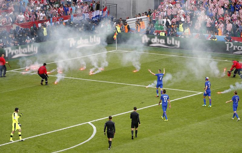 La afición asistente se alzó protagonista tras el lanzamiento de numerosas bengalas procedentes del sector croata al terreno de juego que obligaron a detener el partido. La debacle balcánica había comenzado y tras unos minutos de parón se certificó el desplome de Croacia.