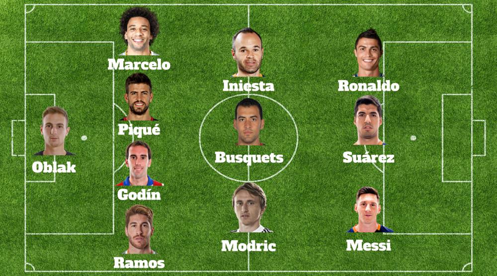 Ya se sabe cual ha sido el once ideal elegido para esta temporada por los internautas que han acudido a votar a la web de la liga de fútbol. Todos los jugadores forman parte de los tres primeros clasificados en el torneo liguero. Los elegidos han sido : Oblak, Godín, Piqué, Sergio Ramos, Marcelo, Iniesta, Busquets, Modric, Luis Suárez, Messi y Cristiano Ronaldo.