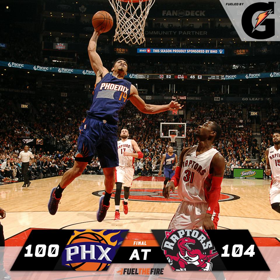 Después de un tiempo de espera de Phoenix, Thomas casi perdió la pelota en la mitad de cancha, con él y Lowry eventualmente de reuniones para un salto entre dos. Un juego acrobático por Ross ayudó a los Raptors mantener dentro de límites de pelota, y DeRozan hizo un par de tiros libres con 14 segundos por jugarse, estirando la ventaja de Toronto a cuatro.