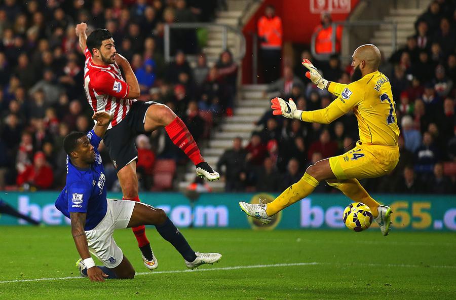 En la primera mitad hubo alternativas para ambos conjuntos, con ocasiones de peligro de un área a otra. Pelle y Long tuvieron las de mayor peligro local, mientras que por parte del Everton fueron Lukaku y Barkley. Southampton se fue por delante en el marcador al descanso tras el tanto en un córner en su propia portería de Lukaku a los 38'.